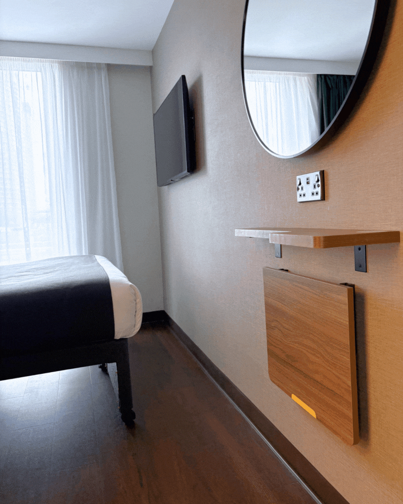 Looking for shelving? Surprise - it’s built into the mirrored bedside cupboard, complete with storage space and added plug sockets!