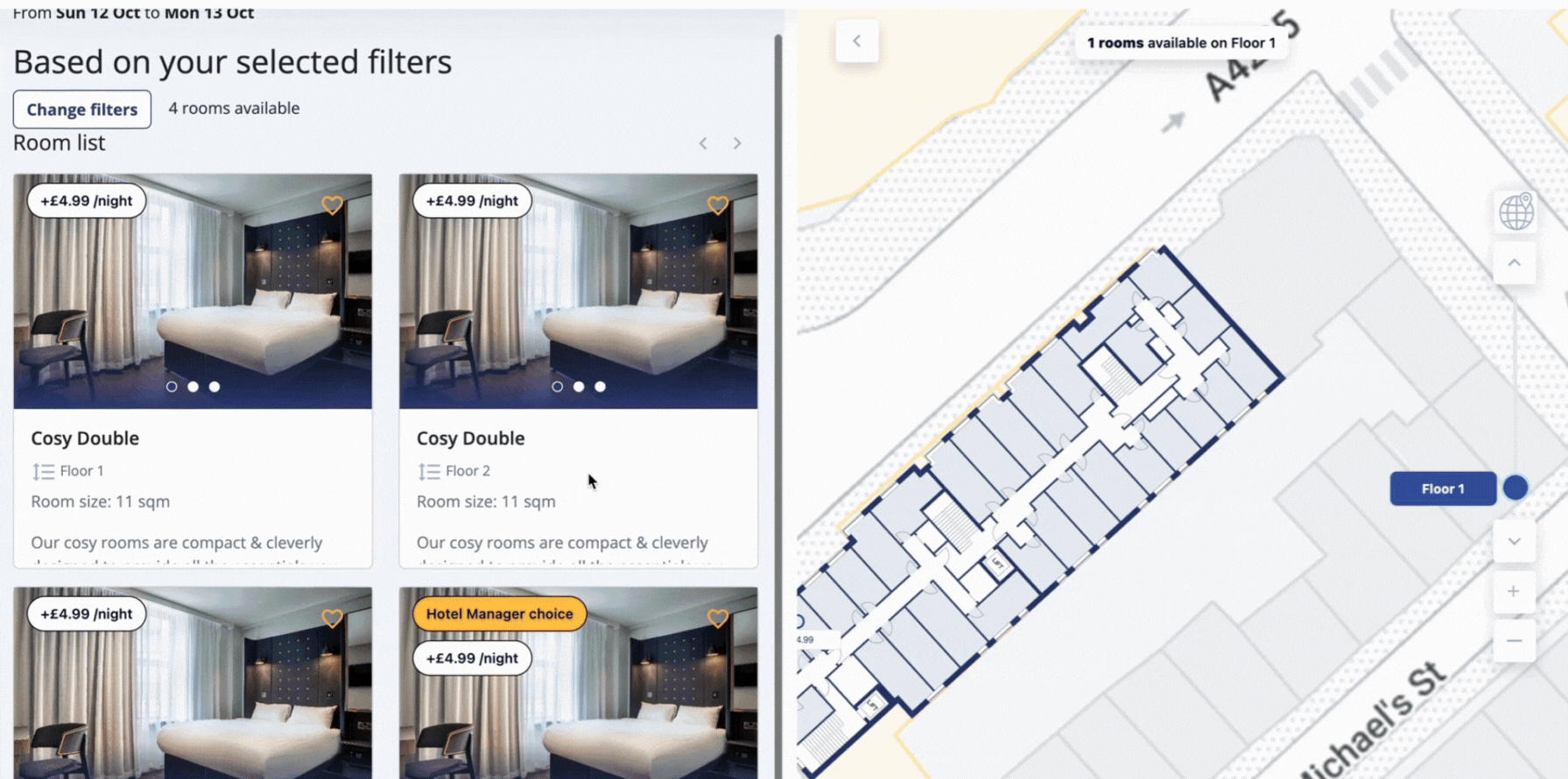 Follow the link - filter by preferred features then browse an interactive floor plan where available rooms handpicked by our hotel managers are marked with a circle.