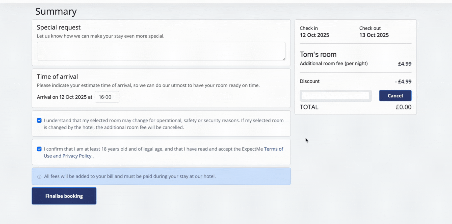 Once you've selected your preferred room, review your selection, add notes like arrival time and apply your promo code to enjoy as a free perk.